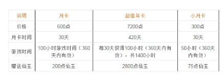 夢幻西游年卡、月卡規則說明 夢幻西游年卡價格為7200點,月卡價格為600點,小月卡價格為300點,每個套餐享受到的福利不同持續的有效時間也不同,具體詳情如下: 游戲時間 100小時游戲時間(360天內有效) 每30天獲得100小時(360天內有效),共1400小時 50小時(3...